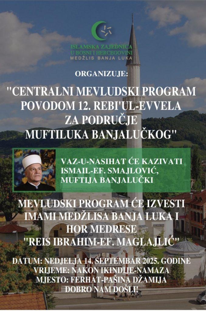 U nedjelju 14. septembra 2025. godine nakon ikindije-namaza bit će upriličen Centralni mevludski program povodom 12. rebi’ul-evvela za područje Muftiluka banjalučkog u Ferhat-pašinoj džamiji.
