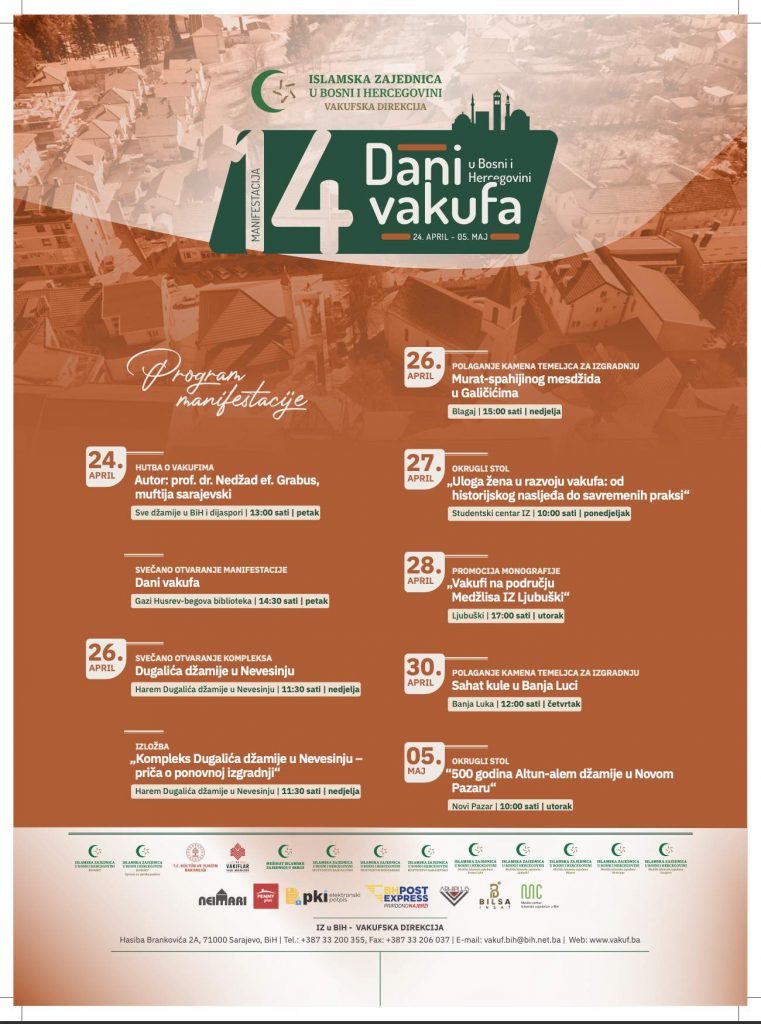 Ovogodišnja, 14. manifestacija “Dani vakufa”, koju organizira Vakufska direkcija Islamske zajednice u Bosni i Hercegovini, bit će održana u više gradova Bosne i Hercegovine i regiona, a centralno otvaranje planirano je 24. aprila u Gazi Husrev-begovoj biblioteci u Sarajevu.